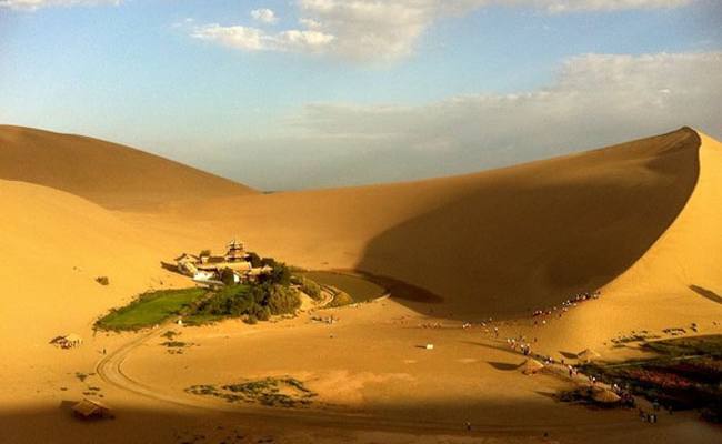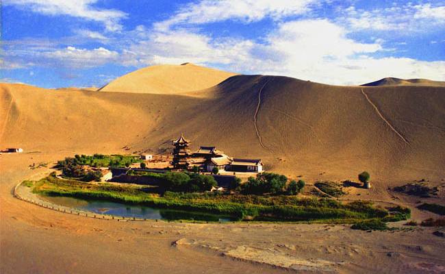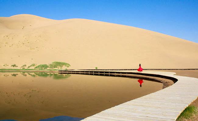 鸣沙山月牙泉,千年山泉共处,沙水共生,被誉为中国沙漠奇观