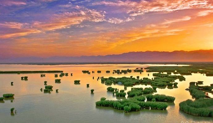 沙湖,位于银川市西北约50公里处的平罗县境内,是一处融江南水乡与大漠风光为一体的生态旅游景区。沙湖景区由北面的湖区和南边的沙漠区组成,沙漠区一边是湖,一边是人工渠,与陆地没有连接,去沙漠区必须购买游船票。沙湖还是观鸟的好去处,湖区繁殖的斑嘴鸭、赤嘴鸭和苍鹭。此外还有数量众多的候鸟,时间主要集中在每年的4-5月和9-10月两个时期。候鸟期时,这里是百鸟争鸣,群鸟飞起时,遮天蔽日十分壮观。冬季沙湖还有冰雕展示和滑雪场。